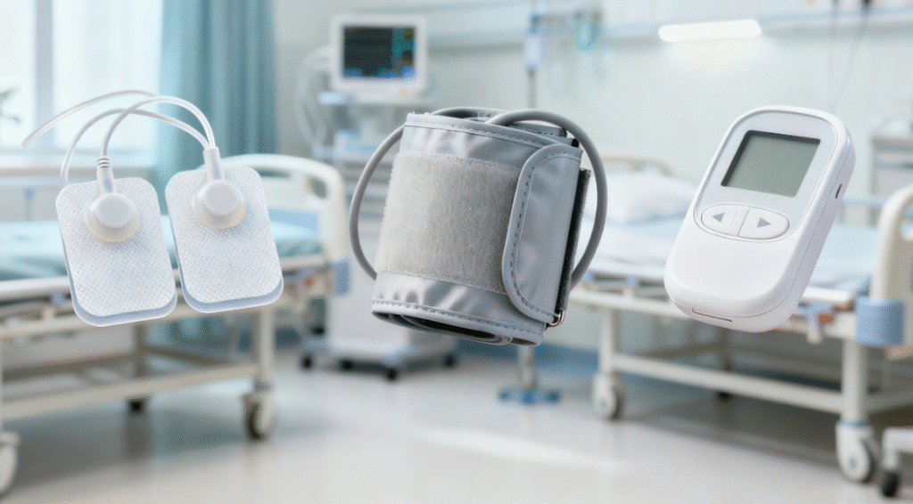 Devices like ECG electrodes, blood pressure cuffs, or glucose monitors contact skin but are not implanted. Key considerations include skin compatibility, flexibility, and ease of manufacturing.