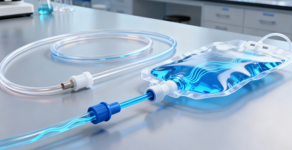 Tubing, catheters, IV bags, and fluid reservoirs must resist chemical attack from drugs, saline, or blood while preventing leaching.